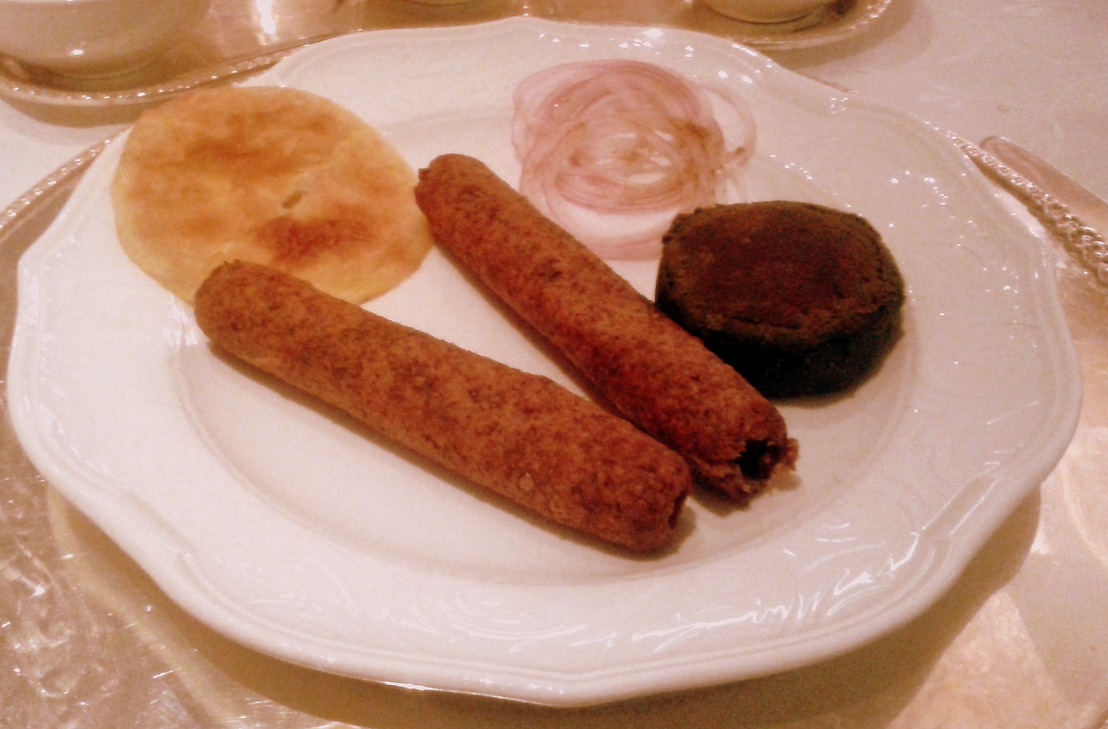 The service was prompt and our starters arrived in good time and brought along with them a pleasing scent of ghee, however I was startled looking at the portion size , 3 pieces of the Hara Kabab and 4 of the seekh for around INR 1200 each was steep I thought. The kabab was eased into our plates and was served with Sheermal. The kebab was a spinach patty cooked in copious amounts of ghee and stuffed with gram lentils and pan-fried. It was crumbly and mildly spiced, almost melt in mouth kinds. Sheermal, a lightly sweetened flatbread made out of refined flour, milk and saffron was the best I have ever tasted. The Seekh on the other hand had a completely different texture, firm and dry and it came with navratan chutney. The seekh was made of Lotus stem and puffed lotus seeds; I must admit I could not appreciate the flavours of the key ingredients as I have not tasted them in sometime. It was heavy on Indian spices and went well with the green chutney; a slightly moist seekh would have made it even better.