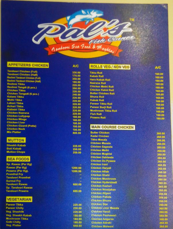 After meeting up at the Carter road promenade on a Saturday evening;the first thing on agenda was to decide on a dinner venue. We had our experiences at the Burgs (I think all veggie burgers taste same), Greko ( super food), the momo place etc in the past and this time we wanted something desi. I suggested them Mini-Punjab( 16th road junction, the KFC lane ) which I had heard about as a VFM (value for money) eatery, but it was found under renovation and we quickly made our way into Pals Seafood Corner next door. Two of us were veggies and one not, so we scanned their menu before we entered,they had plenty of options.