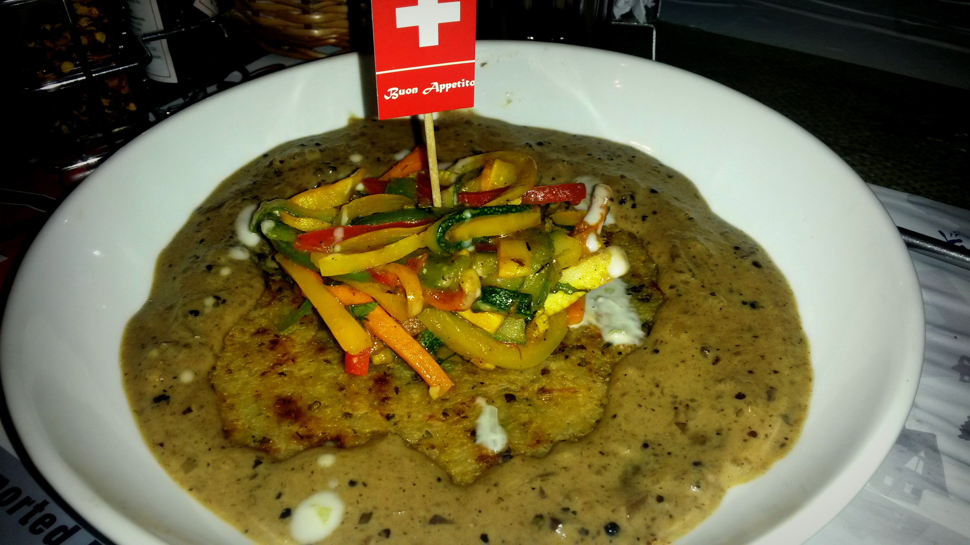 They got this one wrong completely wrong to the best of experiences of having eaten and made a roesti.  The sauce was great, the veggies had a bite but the roesti was a chewy and floury and a ‘set dosa’ like appearance.  A good roesti is about the crispness and the shreds. Fail