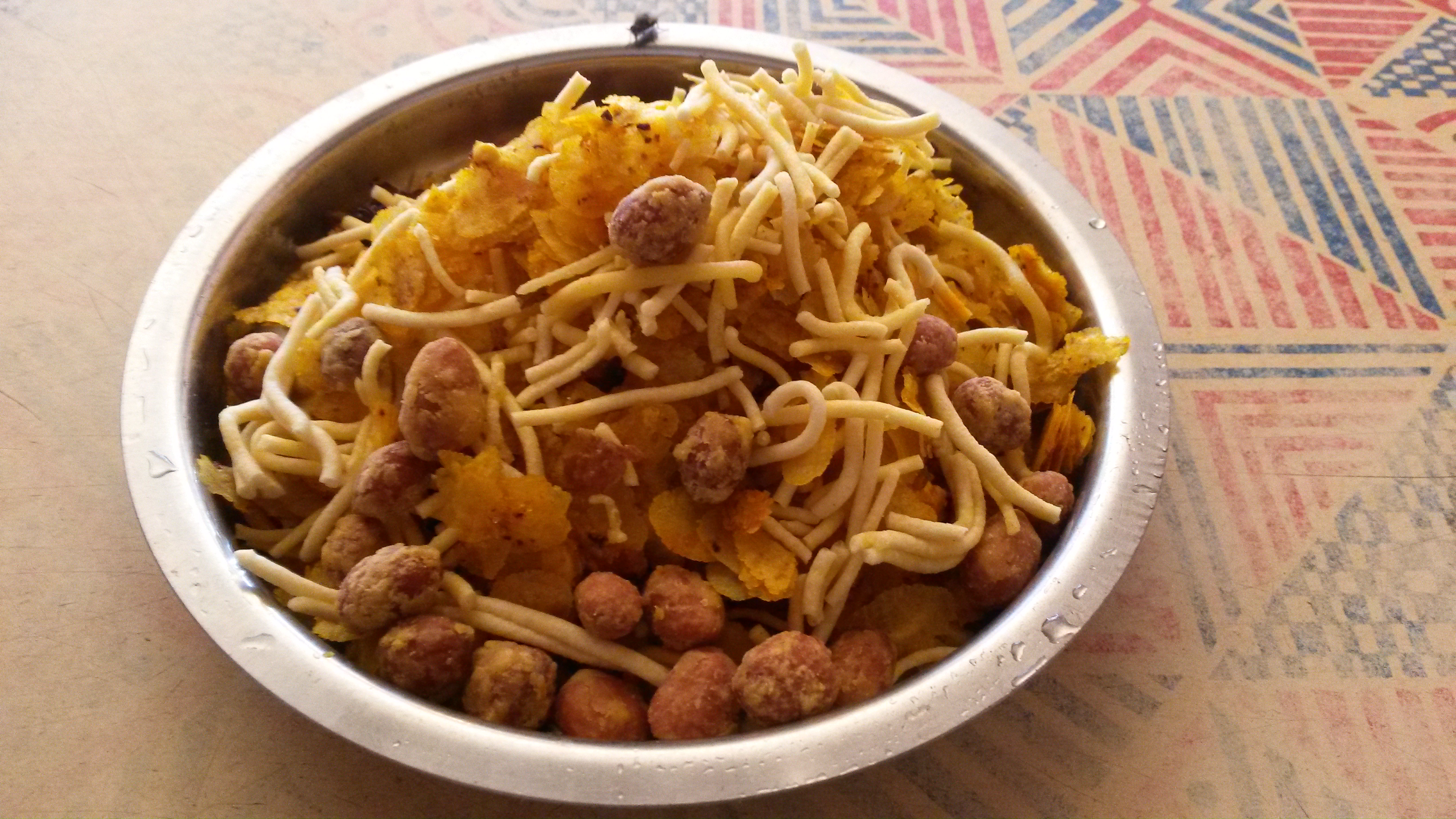 Misal Bhaji … Coconut , jaggery and chilli flavoured rice flakes/thin poha doused with coconut gravy and topped with thick sev and chilli peanuts