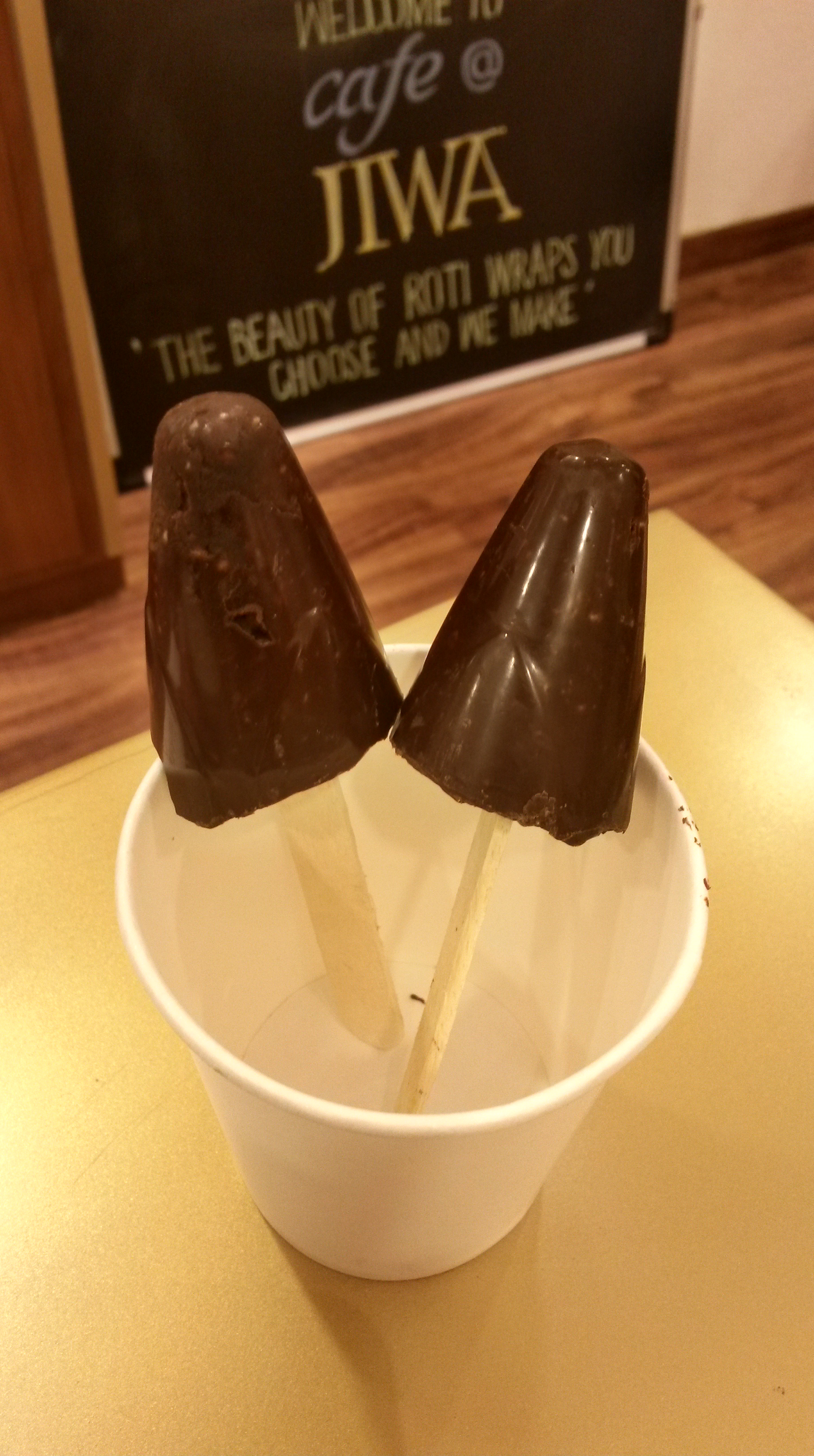 Chocolate Popsicle (RS 65) Dark chocolate with honey and crunchy muesli on a stick. It was more of a petit four to accompany a coffee.