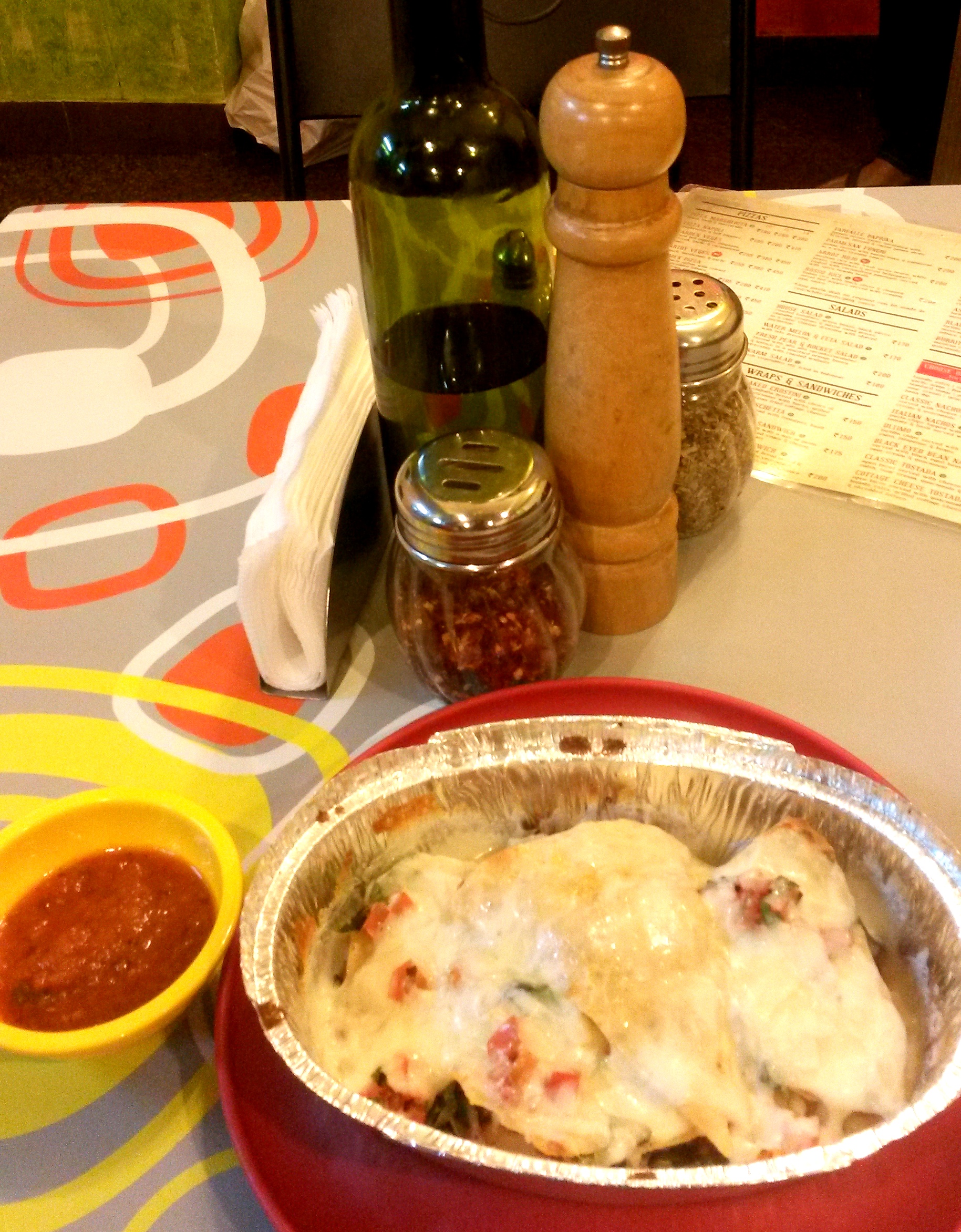 No surprises in the menu, as simple as pizzas, pastas, salads, burritos, sandwiches, nachos and a couple of desserts. Pasta in white, red or pink sauce would sound a sacrilege to most of us, but when it comes to making things easier I too think it is easier to remember and more approachable, red than pomodoro or a white than a Alfredo and this how it’s hinted on the menu. Only a fast-food joint can get away with this nomenclature. Nonetheless let’s look at my hog for that evening: