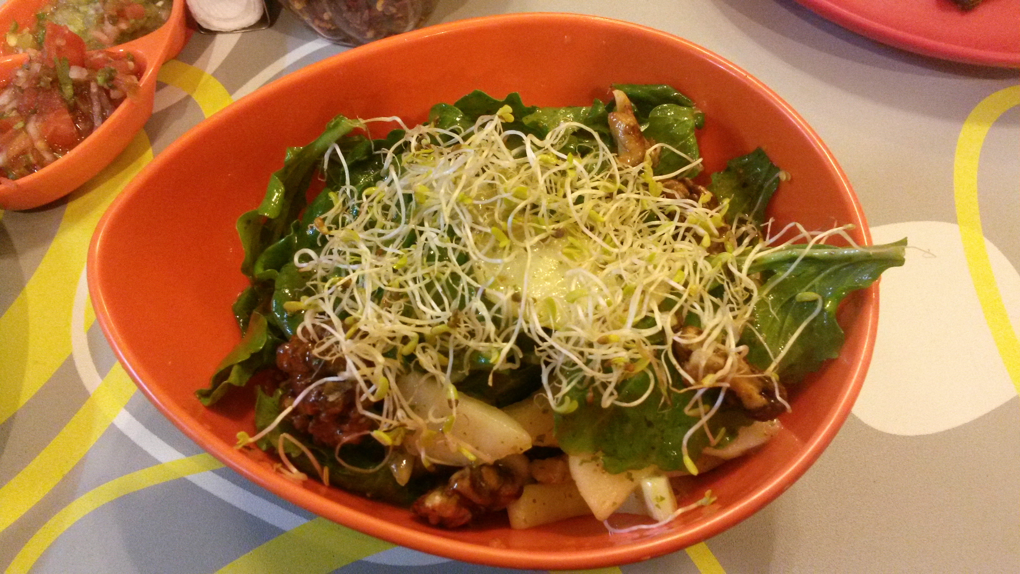 Fresh Pear and Rocket Salad (Rs 200): They have the combo right, spicy rocket, sweet pear, refreshing cucumber, crunchy spiced walnuts and some healthy sprinkling of Alfa sprouts. Their Orange, mustard and honey dressing lacked the necessary acidity making the salad a bit sweet. I enjoyed my salad nonetheless; a sprinkling of some lime juice would help.