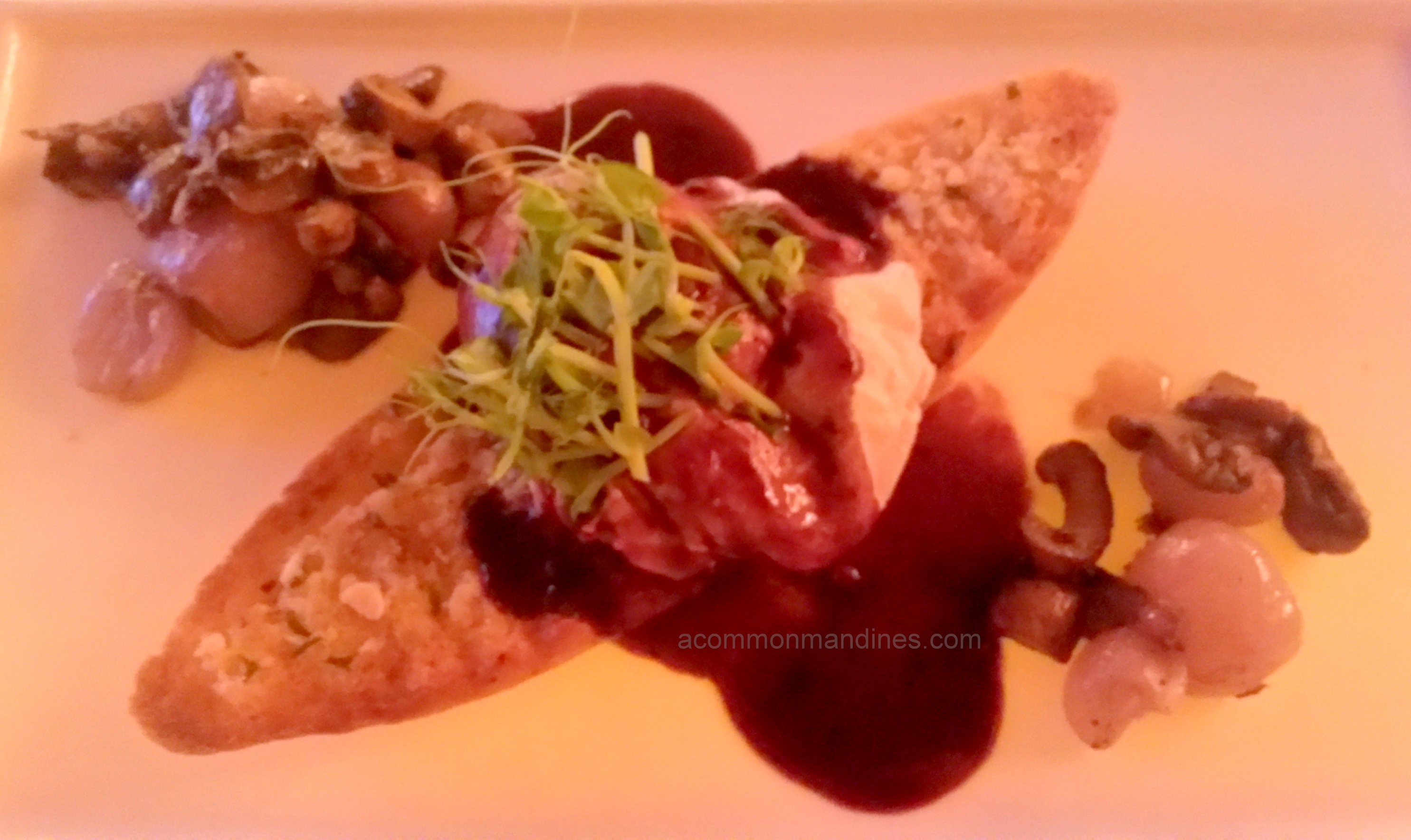 The Grilled Green Apple Galette with goat cheese and slow cooked onions on a biscuity crust was a fantastic in flavour. I would have loved a crumbly crust instead. The Oeuf en meurette (Egg preparation) on sharp garlic bread, sweet onions, soft mushrooms and the umami laden Meurette sauce with a poached egg on top was a good deal. Seems very breakfast, mid-morning like preparation but I did not care much.