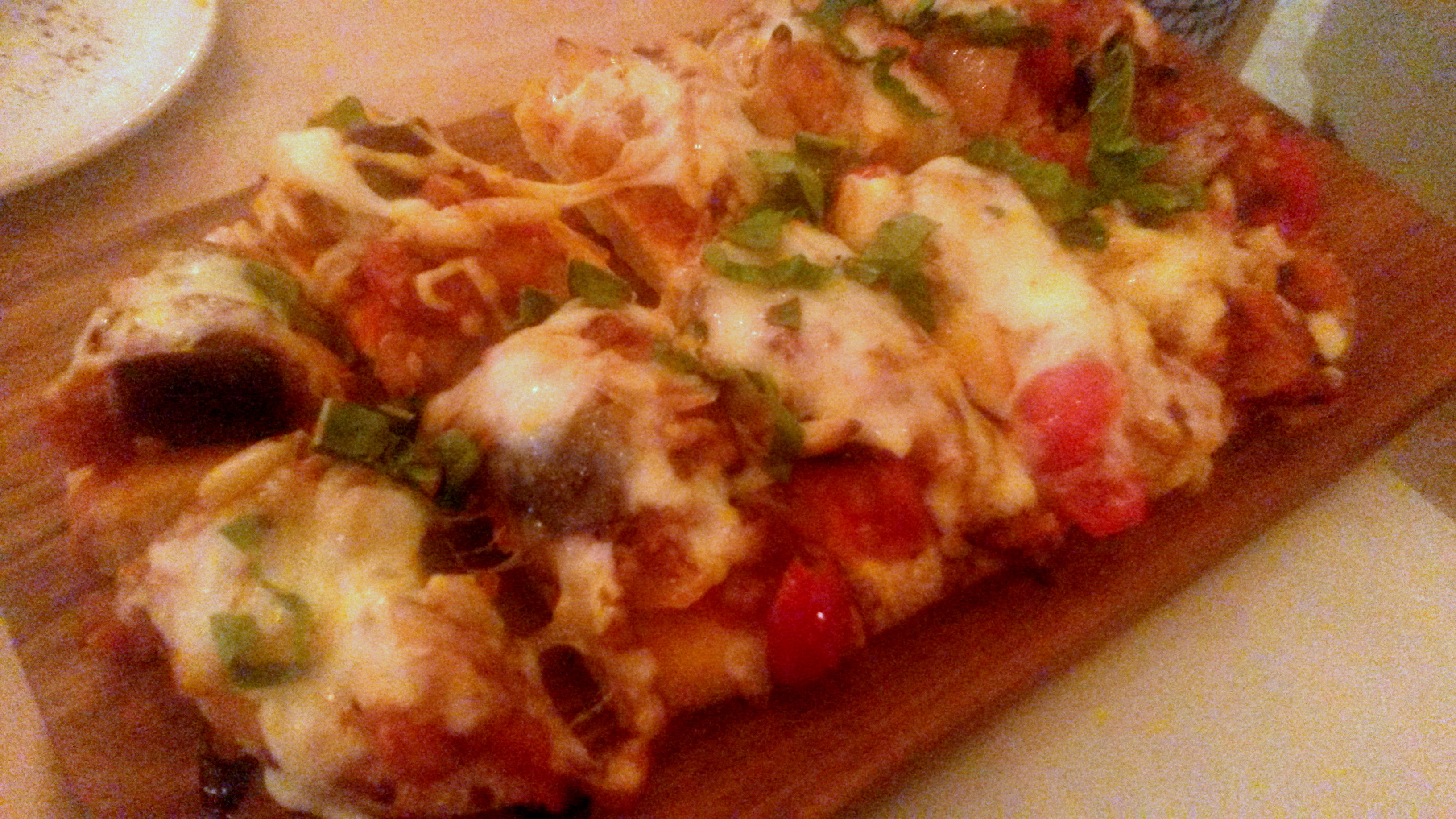 It comes on a flatbread (read thick crust Dominos), simple but powerful. Great to go with drinks. They have another with vegetables and roasted garlic.