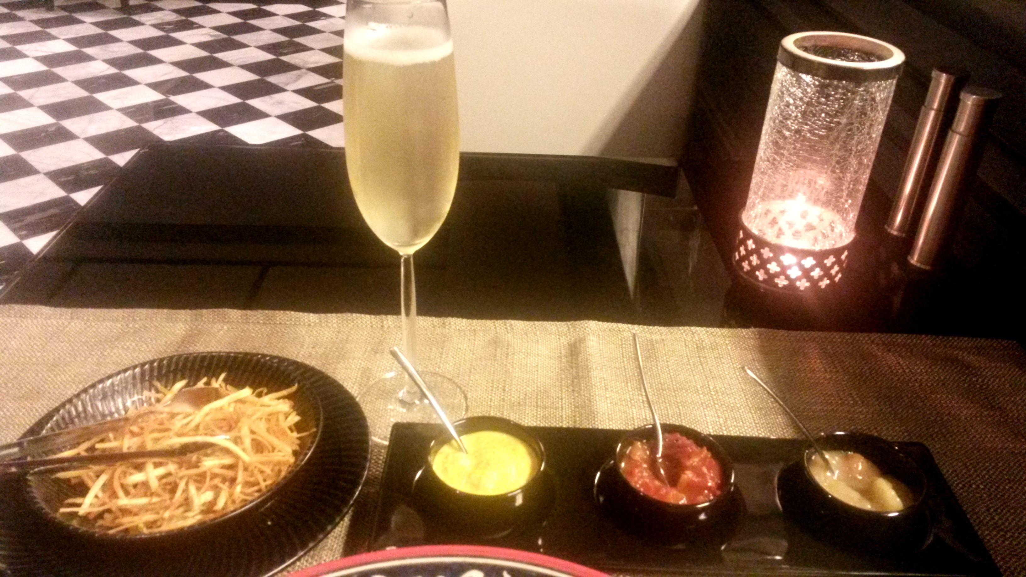 Parganas means ‘revenue unit’ and this certainly shall be or is one for what they have to offer. A small restaurant of 44 covers it has a colonial charm specially with the checkered flooring. I settled down next to the glass wall of the show kitchen to see the chefs in action. Aloo bhaja (Fried potato Julienne) with Kasundi (Mustard), Tomato and Date chutney and raw mango chutney were quickly brought to the table; they are classic Bengali pre-meal munchies. I chose a Zampa, an Indian sparkling as their wine list seemed to be in a sorry state with a lot of wines way past their age. The menu for the evening was as below! I almost gobbled up the Bengali repertoire…