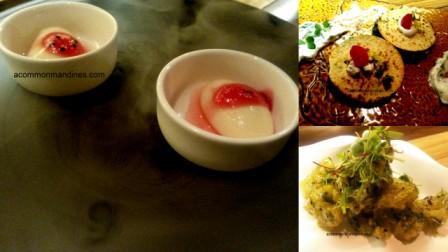 Mishti Doi shots were the first move; done with the spherification technique the sweet with the tang set our palates up for the evening. We started with Apple Foamintini a straightforward Apple martini with a twist of sweet mint foam on top. The acidity from the granny smiths was balanced well with the sweet foam. So much as I did, I am sure you got the hang of farzification with the meal opener.  The palak paneer Quesadillas came in makke di rotis than tortillas, the kachori with Imli foam was quite refreshing and so was the curry leaf martini which came topped with Aam papad chutney foam.  The karela (bitter gourd) calamari embodied the spirit of Farzification in earnest.  The Dal Chawal Arancinis however could have been a little moist; the chutneys saved them to a certain extent.