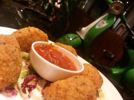 We started with a crisp Alois Lageder Pinot Grigio from Italy and a selection of antipasti, the luscious Melanzane Parmigiana, Mozzarelline Frite (crumb fried mozzarella, I prefer the fresh one) and Palle di Riso (Crumb fried rice balls with cheese and ‘real’ green chilly), they were simple and flavorsome with fair portion sizes. Then came the Napoli style Portobello pizza with mushrooms, truffle oil, rocket and Grana Padano Cheese (a craft mostly run by Sikh families in Emilia Romagna), a drizzle of Olive oil on the wild rockets made it richer. We had this with a glass for fruity and sassy Sangiovese from Villa Giulli. The food had done us in but we couldn’t resist the Spaghetti Aglio olio and Tagliatelle in Pesto. They were supreme. We ended our meal with a silky pannacotta and a rather heavy ricotta pie.
